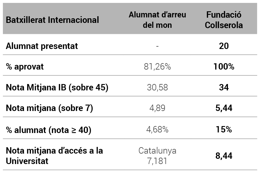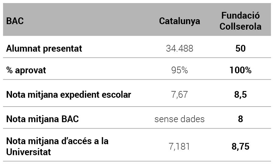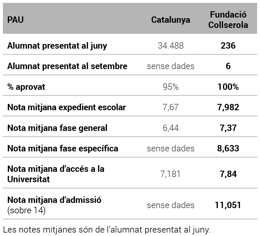 Els resultats de les diferents opcions de Batxillerat confirmen la qualitat acadèmica de l’etapa i posen de manifest la preparació de l’alumnat per afrontar amb garanties les Proves d’Accés a la Universitat (PAU) i els estudis posteriors. Són unes dades que avalen un model educatiu rigorós i equilibrat i que situen el nostre alumnat en una posició òptima per accedir a les opcions universitàries desitjades.