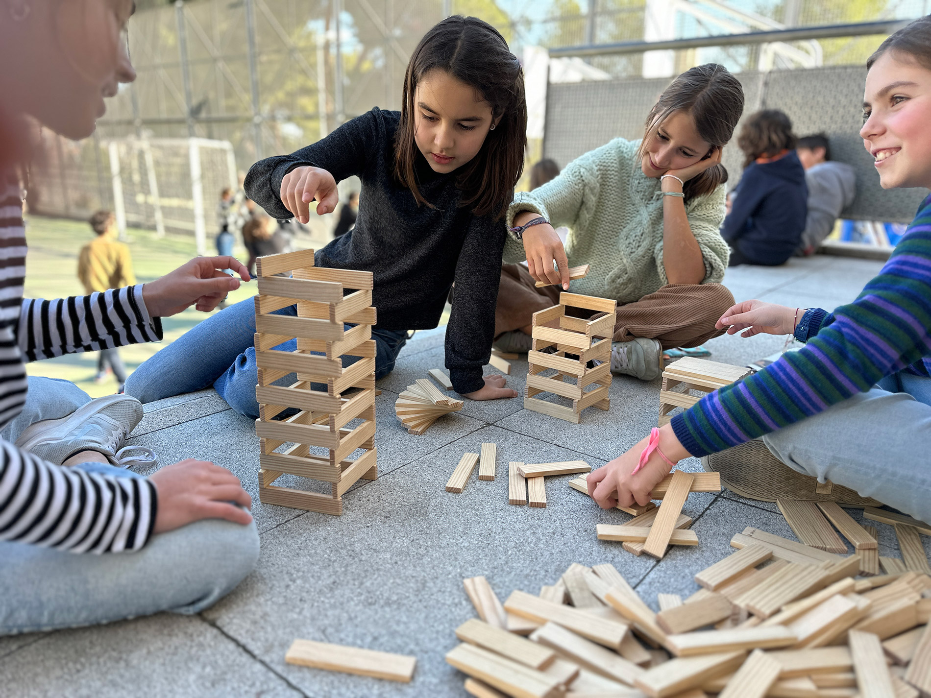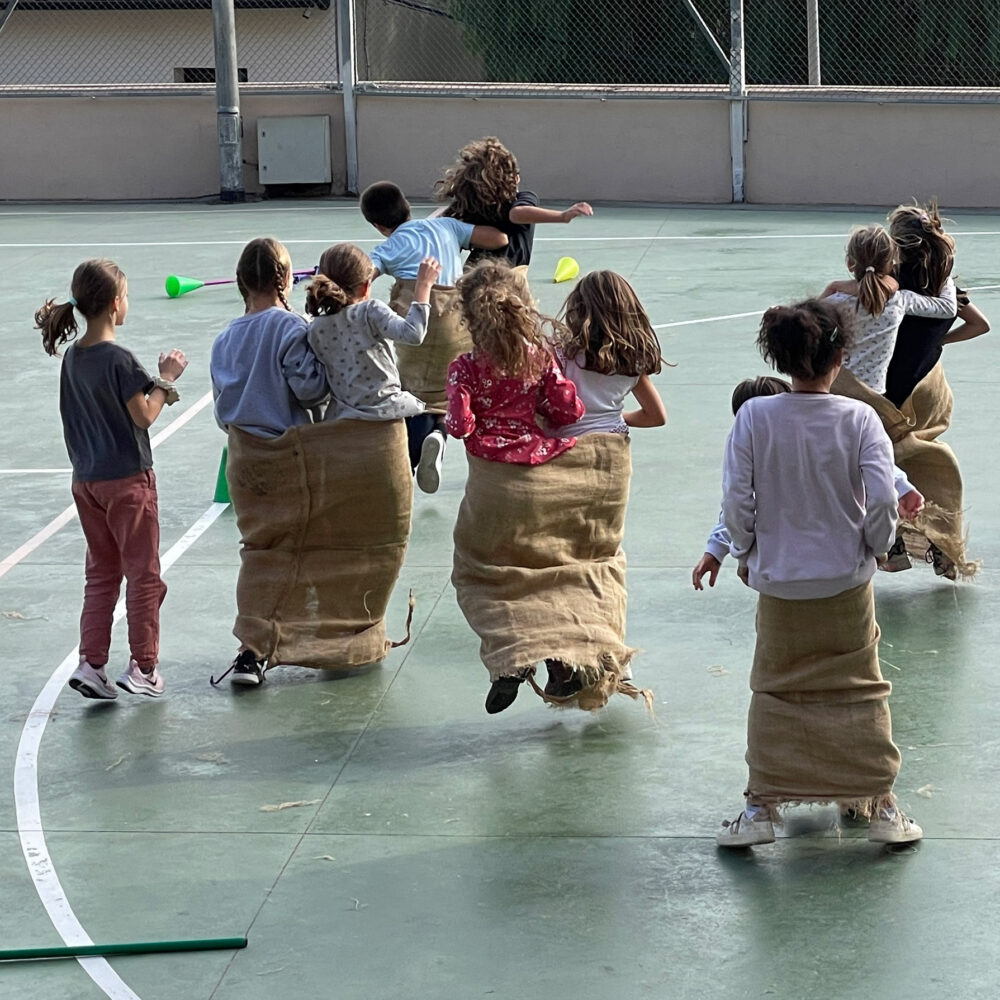 Concebem el pati com a espai de lleure educatiu. Aquesta estona del migdia és un gran moment per treballar les relacions i la convivència entre alumnes. L’eina educativa d’aquest moment és el joc i, cada dia, quan arriben al pati, poden optar pel seu joc lliure o per qualsevol de les activitats que se’ls proposen: capses de jocs, tallers de creació de jocs, jocs dirigits, jocs tradicionals, jocs esportius…